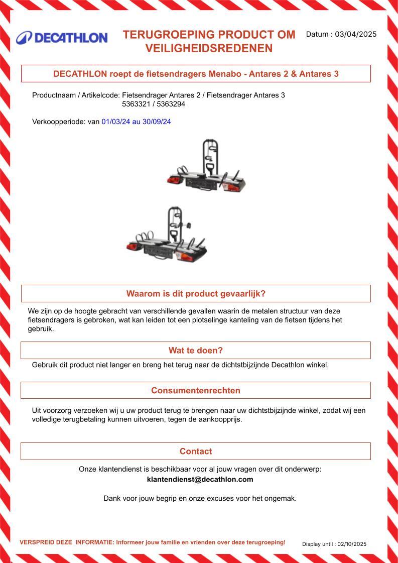 Heb je de drager aan iemand cadeau gedaan, doorverkocht of uitgeleend? Ook dan drukt Decathlon je op het hart om te controleren of het om de getroffen productcodes gaat, en zo nodig contact op te nemen met de gebruikers van de producten.